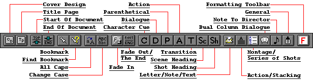 The ScreenForge v1.1a toolbar, shown here, allows easy access to the features that are used in the creation of a screenplay. Seventeen of these buttons have combination keys to allow the user to run macros or switch between element styles easily. Four of them are built-in Word functions, Start Of Document, End Of Document, All Caps, and Change Case. Three are macros, FADE IN:, FADE OUT THE END, and SHOT STYLE, one is used at the beginning, and the other at the end of the screenplay to automatically insert the text, as well as the formatting of these elements, for the user, the last one turns a selection into a shot style type sub-heading. The final ten that have combination keys assigned are certain screenwriting elements that are or may be used in a screenplay, Character Cue, Dialogue, Parenthetical, Action, Transition, Scene Heading, Letter/Note/Text, Action/Stacking, Montage/Series of Shots, and General. Combination key assignments can be changed, or assigned to any styles or macros available, to better suit the individual's work habits.